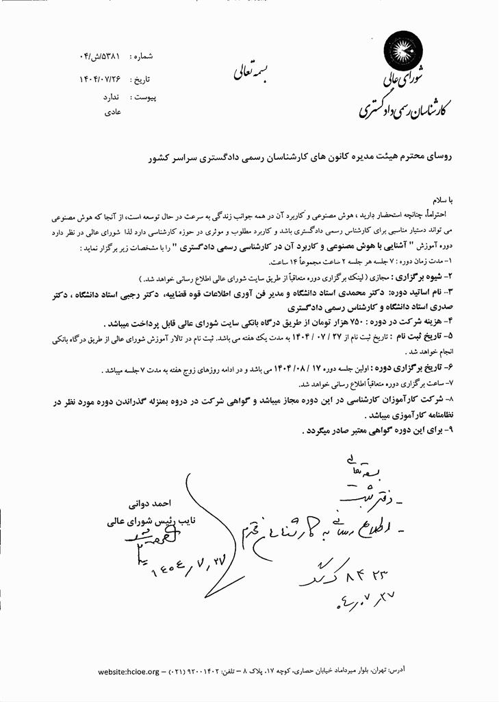 عنوان دوره : آشنایی با هوش مصنوعی و کاربرد آن در کارشناسی رسمی دادگستری مدت دوره : ۷ جلسه – ۱۴ ساعت به صورت مجازی شروع دوره : از ۱۴۰۴/۰۸/۱۷ ساعت و برنامه زمان بندی برگزاری دوره متعاقبا اطلاع رسانی خواهد شد. “ثبت نام در این دوره علاوه بر کارشناسان رسمی، برای کارآموزان کارشناسی هم ...